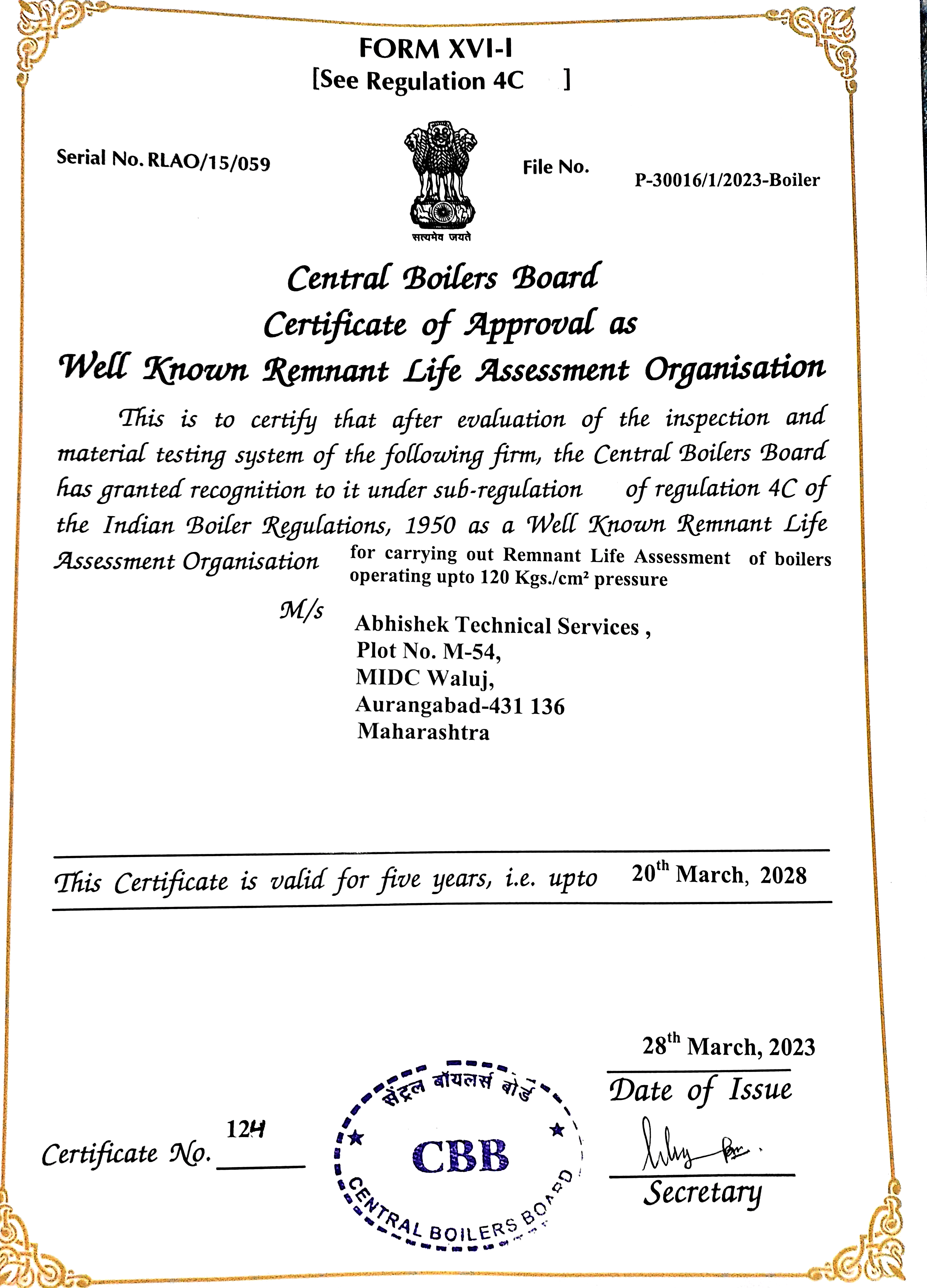 ABHISHEK TECHNICAL SERVICES . is accredited by Central Boilers Board and we are a certified Remnant Life Assessment Organization and also a well-known We provide In-Service Inspection for RLA Studies of for ensuring Safety and Integrity of equipment’s of the Thermal Power Plants, Hydro Power Plants, Petroleum Refineries, etc. to maintain the operating capacity for a longer period of time.